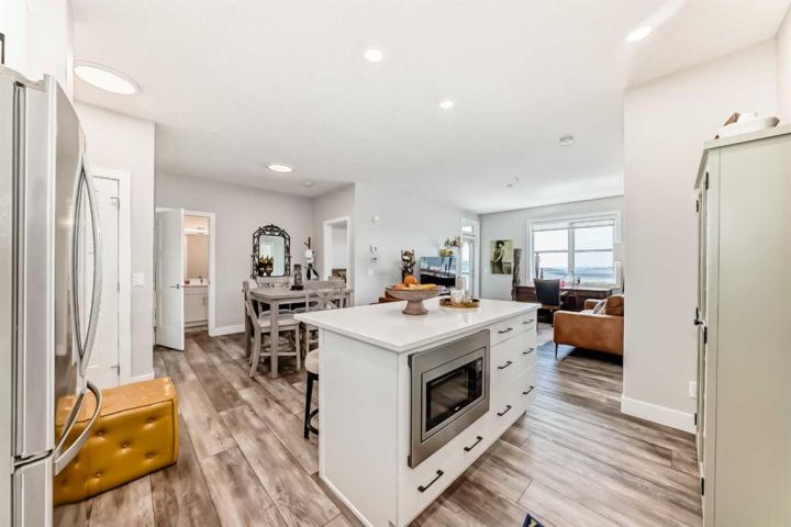 Welcome to 85th & Park; where modern design meets elevated condo living in the sought-after community of Aspen Woods/Springbank Hill. Built in 2023, this beautifully upgraded 2 bedroom, 2 bathroom condo combines stylish finishes with everyday convenience. Step into a bright, open layout featuring quartz countertops, a large central island, and premium stainless-steel appliances with a chimney hood fan. Durable laminate flooring flows throughout the main living spaces, while plush carpet in the bedrooms adds comfort. The bathrooms are equally impressive — one with a deep soaker tub and full tile surround, the other with a spacious glass-enclosed shower. Enjoy the ease of in-suite laundry, a sunny southwest-facing balcony with gas hookup, and an enviable location right across from the elevator with no neighbours across the hall. This unit also comes with titled underground parking and a private storage space directly behind your stall, plus a separate storage locker conveniently located down the hall. Set in a prime SW location, you’re just minutes from shopping, schools, parks, pathways, and golf courses, making this the perfect blend of comfort and lifestyle. Don’t miss your chance, book your private showing today!