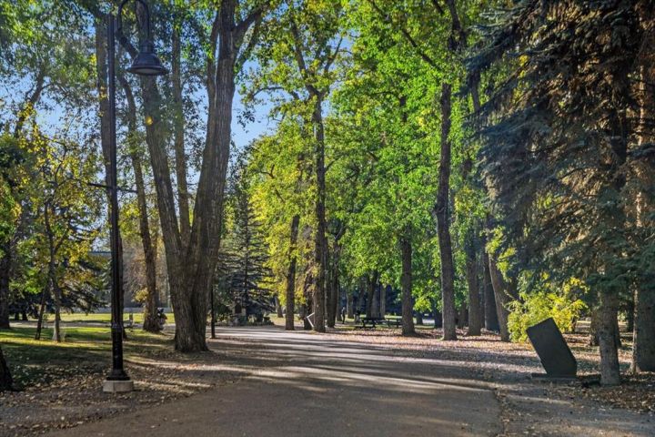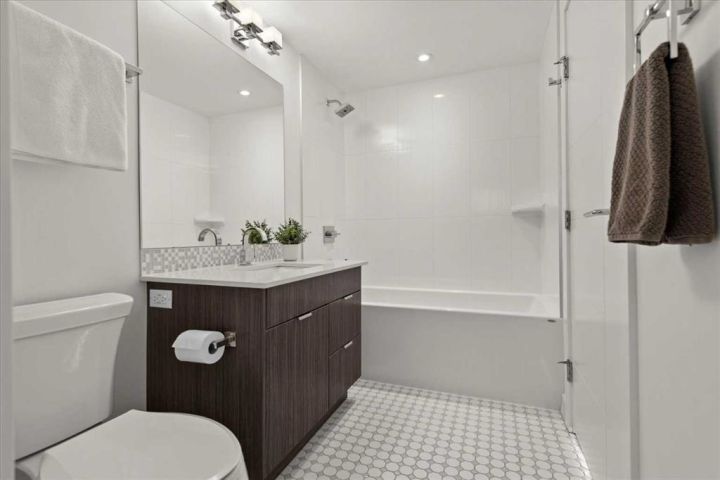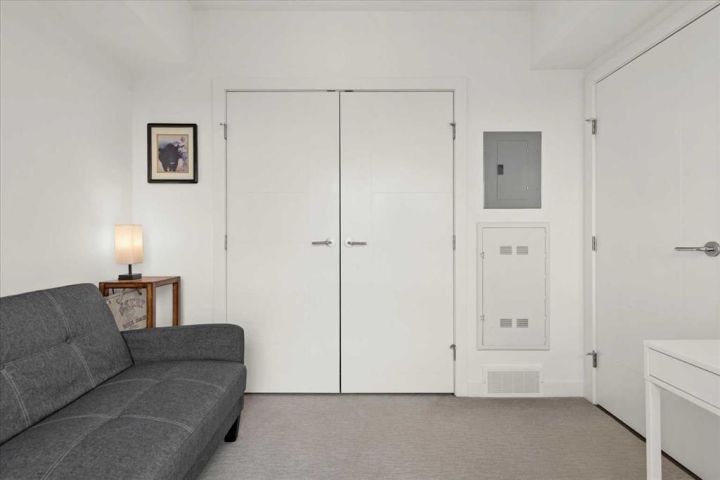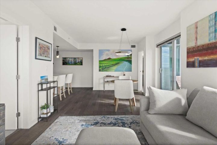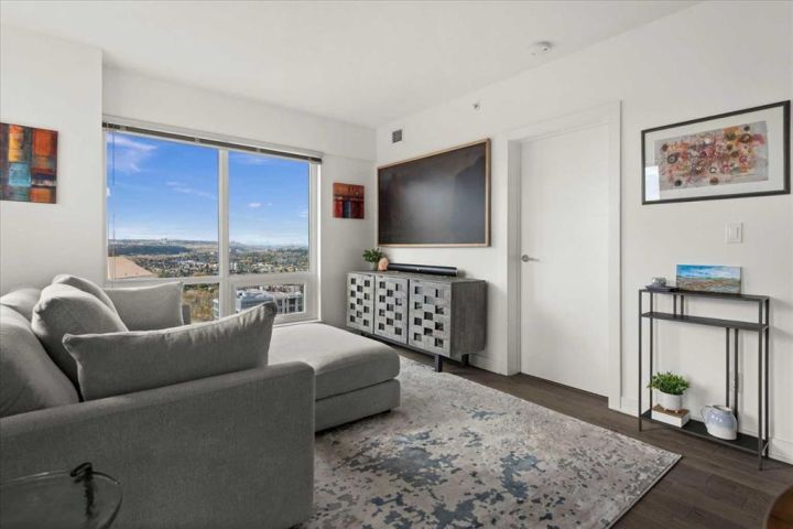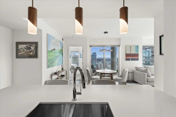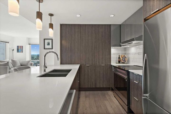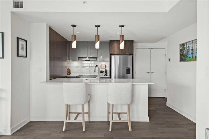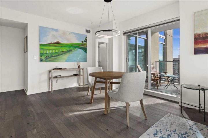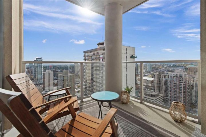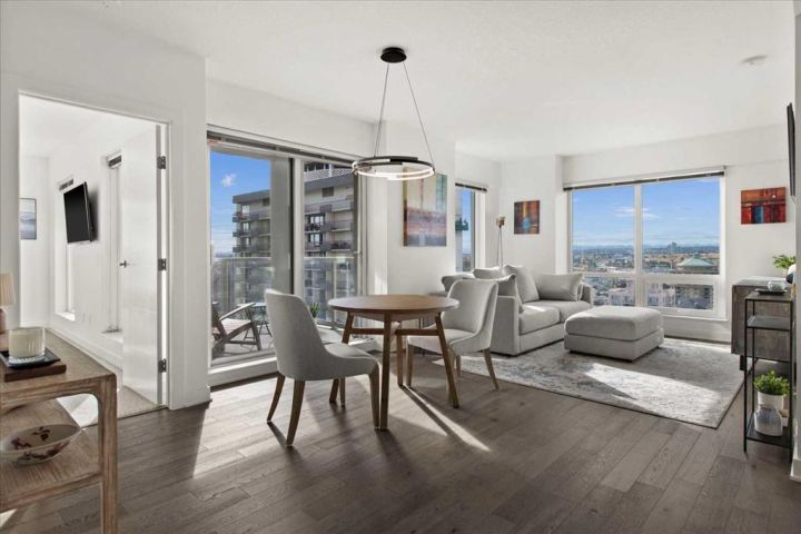 Are you looking for stunning mountain and river views in a luxury building? What about being just steps to the Bow River, Eau Claire, Kensington and Prince’s Island Park? Situated as the corner SW unit on the 31st floor, this 2-bedroom/2-bathroom home is filled with light and offers views from every window. Engineered hardwood floors span the open concept floor plan and compliment the modern finishings. The two-tone kitchen has timeliness quartz counters, peninsula island, great storage and subway tile backsplash. Classic stainless-steel appliances include a new range, built in microwave, Fisher Paykel refrigerator, and a new washer and dryer set. Relax or entertain in your living area with expansive picture windows and take in the fabulous views. Just past the dining room, the sunshine cascades onto the covered balcony and you’ll find yourself out here with coffee or wine soaking up the scenery. Flat painted ceilings and bespoke lighting fixtures add to the contemporary aesthetic. Wake up in the owner’s suite with mountain views and FYI this room accommodates a king size bed with end tables. The ensuite is conveniently attached to the generous walk in closet that just underwent a glow up with built in drawers and more efficient hanging system. On the other side of the home you will find the second bedroom that has more of those stunning views. Tucked around the corner in the foyer, find another full bathroom featuring a glass shower with ceiling height tile walls, the laundry and coat closet. This home also offers a titled parking spot in the heated parkade and a storage locker. Your lifestyle is about to level up, as this air-conditioned prestigious building is amenity rich and beautifully designed. You’ll feel it from the moment the concierge greets you in the formal lobby all the way to your door, as even the hallway to your new home feels like a luxury hotel. Enjoy the 36th floor Sky Lounge, party room with kitchen, yoga studio, gym, billiards room and rooftop terraces. You will be high above the hustle and bustle of the DT Core but you will be steps to transit, shopping, dining and the joy of the paths along the river. This home is in pristine condition and is just what you’ve been waiting for. Contact your trusted agent for a showing before She Gon’!