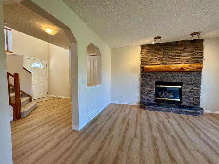 Renovated 3 bedroom 2.5 bathroom detached house in a quiet community, offering over 2500 sq ft of living space. In addition to the living room, there is a large, bright bonus space on the upper level with high ceilings. The upper level features great family layout, including a primary bedroom with large ensuite bathroom and walk in closet, along with two other bedrooms and another full bathroom. Recent renovations include new flooring, quartz countertops, sinks, faucets, interior paint, and stove. Enjoy the private fenced backyard, open plan kitchen and large finished basement. Park in the double car garage or the two car driveway. The property backs onto path leading to a playground. Easy access to highway 1A and Calgary, and a short drive to the mountains.