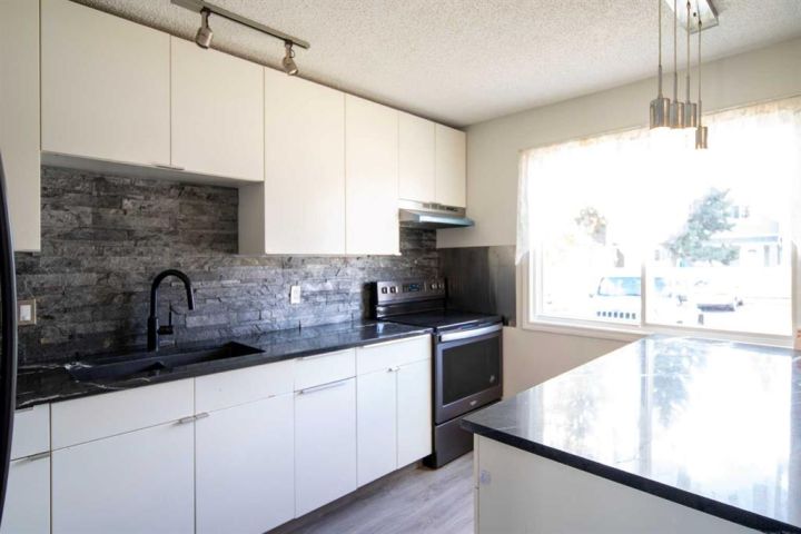 Welcome to this beautifully updated 3-bedroom, 1.5-bathroom townhome located in the heart of Marlborough Park! Step inside to find a stunning kitchen featuring granite countertops, sleek black stainless steel appliances, crisp white cabinetry, a stylish stone backsplash, and bright modern lighting. The open-concept living and dining area offers new vinyl plank flooring and plenty of room for entertaining, while the south-facing patio doors fill the space with natural light. A chic half bath completes the main floor. Upstairs, you’ll find a spacious primary bedroom with dual closets, two additional bedrooms—and a beautifully renovated 3-piece bathroom with tile accents and a contemporary vanity. The finished lower level provides a versatile bonus area—perfect for a media room, home gym, or kids’ playroom. Enjoy sunny days in the south-facing backyard, ideal for barbecues and gatherings, with direct access to a peaceful green space. This home also comes with two assigned parking stalls right at the front door. Don’t miss your chance to own this move-in-ready townhome in a fantastic central location!