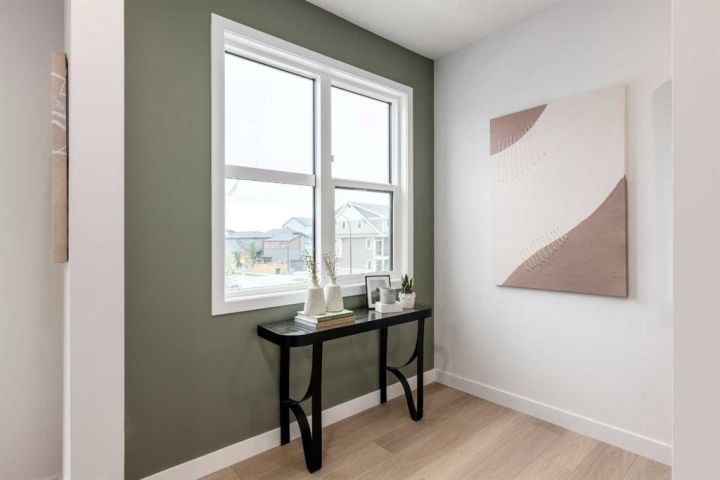 WHEN HOME DOUBLES AS YOUR OFFICE, IT NEEDS TO DO MORE THAN LOOK GOOD. This three-storey townhome in Woodland at Alpine Park was built for the work-from-anywhere crowd — people who want sunlight, flow, and an address that makes getting out of town as easy as logging off. On the ground floor, there’s room to breathe before the day starts. The front entry actually feels like one, not a bottleneck. The flex room catches the western light all afternoon — bright, quiet, and just far enough from the kitchen to feel like you’ve gone somewhere. It’s the kind of workspace that keeps you focused, then doubles as a yoga mat zone or creative corner when the laptop closes. And when it’s time to hit the road, the insulated double garage makes early-morning drives and weekend escapes effortless. Up one level, everything loosens up. The living area takes in the west exposure, keeping the space bright and grounded. At the back, the kitchen layers design and function — quartz counters, full-height backsplash, chimney hood, and an island that becomes whatever the day calls for. Step through to the 17’11” × 6’8” balcony, where coffee breaks, sunset wine, and mountain-planning sessions all feel equally at home. Upstairs, the primary bedroom keeps it calm with a walk-in closet and three-piece ensuite that make mornings feel easy. Two more bedrooms, a full bath, and upper-floor laundry keep everything moving without chaos. Finishes stay timeless: durable LVP, layered lighting, and a modern mix of exterior materials that give Woodland its clean architectural edge. And then there’s Alpine Park — Calgary’s southwest gateway to everywhere. Close enough to the city to keep your commute short, yet perfectly placed for spontaneous mountain runs. Possession is expected in mid-November, just in time to settle in before the snow flies. Come see why Woodland isn’t just where you live — it’s where your week finally finds balance. • PLEASE NOTE: Photos are of a finished Showhome of the same model – fit and finish may differ on finished spec home. Interior selections and floorplans shown in photos.