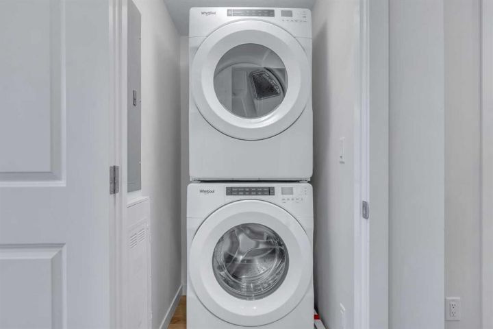 Dishwasher, Electric Range, Microwave, Range Hood, Refrigerator, Washer/Dryer Stacked