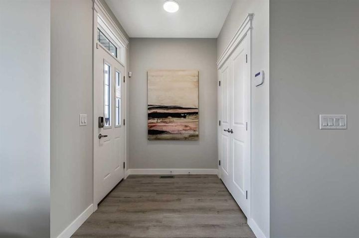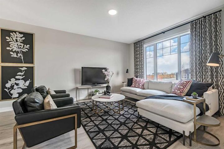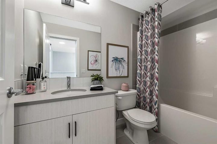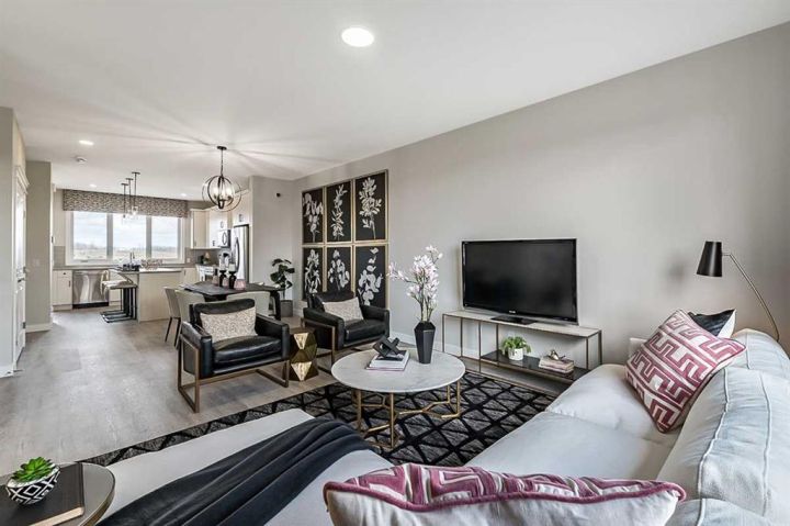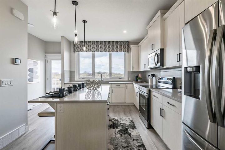 This 1,700 sq ft townhome in Vermilion Hill offers a balanced combination of space, function, and location. Designed with modern finishes and a double detached garage, the home features an open-concept main floor with high ceilings and large windows for natural light. The entryway includes built-in storage and connects to a kitchen equipped with stainless steel appliances, quartz countertops, and a central island. The upper level includes a primary bedroom with a walk-in closet and ensuite, two additional bedrooms, and a loft providing flexible living options. The property is situated approximately 20 minutes from downtown Calgary and within minutes of major amenities such as Costco. Mountain and downtown views contribute to the appeal of the area, which is known for its accessibility and new community design. Renderings and photos are representative.