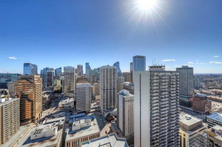 *VISIT MULTIMEDIA LINK FOR FULL DETAILS & FLOORPLANS!* Welcome to SUB-PENTHOUSE LIVING at Vogue! This 2-bed + den, 2-bath condo w/ over 1,200 sq ft on the 34th-floor w/ amazing city skyline band river views boasts two balconies opening off the main living areas. Naturally bright living w/ soaring ceilings, modern light and ceiling details, an open concept floorplan, & engineered hardwood flooring throughout (no carpet!), you are going to love the urban life at Vogue. Gather around the massive island w/ breakfast bar seating & dual undermount sink in the modern, sleek kitchen. Stainless steel appliances include a fridge w/ French doors, a deli drawer, & a freezer drawer, a gas stove & hood fan, a dishwasher, & built-in microwave. White quartz counters & marbled tile backsplash complement the wood & white cabinetry & modern pendant lighting. The open-concept living, dining, and den area has large windows, a gas fireplace, & access to TWO balconies via sliding glass doors. 2 bedrooms flank the main living space for ultimate privacy. The primary bedroom features a walk-in closet w/ custom built-in storage, and a private 5-pc ensuite. Featuring white quartz counters, modern faucets, dual undermount sinks, wood grain cabinetry, a standup shower, & soaker tub w/ full height tile, you’ll find everything you want & more in a primary suite. The secondary bedroom on the opposite side of the unit features a large window, a walk-in closet w/ custom built-in storage, & quick access to the main 4-pc bathroom w/ white a quartz counter, undermount sink, modern faucet, wood grain cabinets & a tub/shower combo w/ full-height tile. Rare for condo living, this unit has a laundry room w/ a washer & dryer, & heated, underground parking w/ a storage locker. VOGUE is a high-end building w/ lots of amenities, including an elegant lobby, full-time concierge, gym, billiards, large party room w/ kitchen & multiple rooftop terraces. Surrounded by parks, transit, the LRT, shopping & more, & within walking distance to the downtown core & all Kensington shops & services – this location truly cannot be beaten.