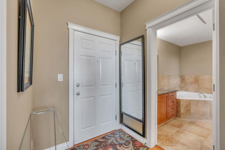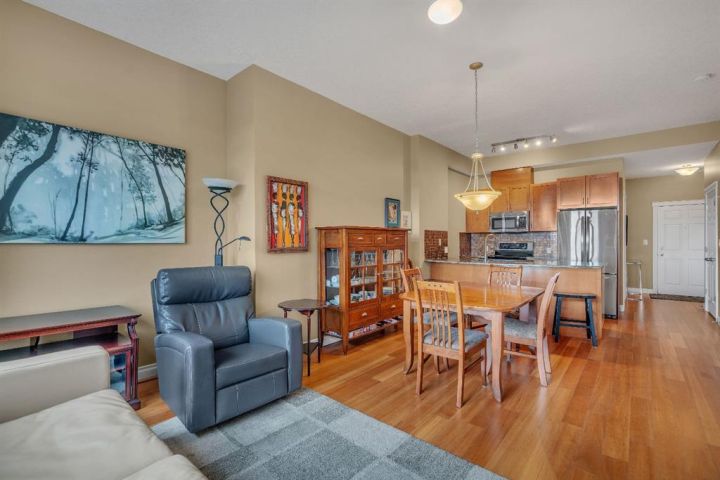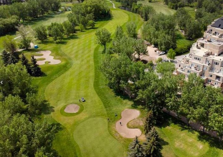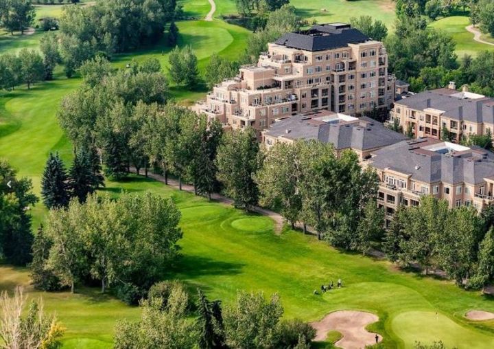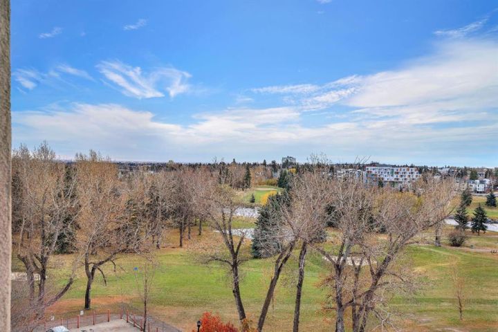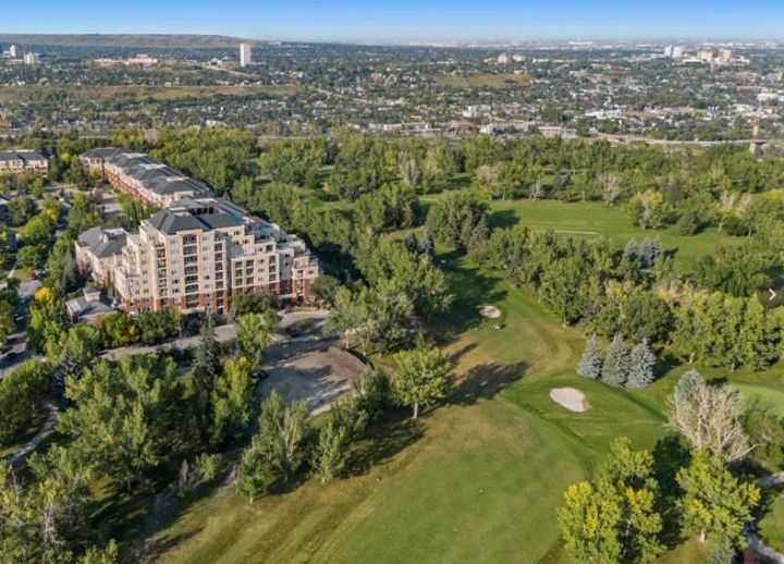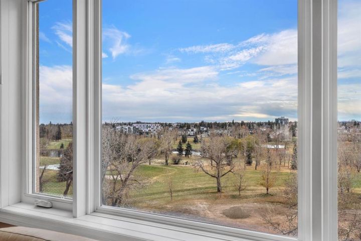 Wake up to the morning sun and serene golf course views in this beautifully appointed one bedroom plus den condo in a concrete building on the 6th floor with 10 ft ceilings, south sun, and air conditioning, what more could you ask for!? The open concept floor plan with newer paint and extra large windows is bathed in natural light, creating a warm and inviting atmosphere throughout. Upgraded finishings include beautiful cherry hardwood flooring and a tiled bathroom with in floor heating.The spacious kitchen features upgraded granite countertops, elegant maple cabinetry, and newer stainless steel appliances, perfect for everyday culinary enjoyment. A large breakfast bar offers a casual dining option and a great space for entertaining. The layout flows seamlessly into the dining and living area, where a soothing gas fireplace anchors the room, providing comfort and ambiance after a long day. Expansive windows frame the picturesque golf course, bringing the outdoors in. The primary suite is a private retreat with walk through closets and a four piece cheater ensuite complete with a soaker tub, walk in shower, and a granite topped vanity with a vessel sink. A versatile den at the front of the unit offers the ideal setup for a home office or guest space and easily accommodates a wardrobe and Murphy bed for visitors. The in suite laundry with front load washer and dryer adds everyday convenience, along with extra storage inside and a separate storage locker in parking area. Enjoy the perfect blend of comfort, functionality, and natural beauty, your morning coffee has never come with a better view. Relax on your oversized balcony and take in the uninterrupted views of Shaganappi Golf Course, the perfect spot to start or end your day. Enjoy the convenience of a titled parking stall and separate storage, along with access to a well equipped gym, stylish party room, recreation area, car wash bay, workshop, and comfortable guest suites for out of town visitors, all part of a well managed building with reasonable condo fees! With quick access to downtown, the LRT, and public transportation, experience the best of central living in Spruce Cliff where urban convenience meets peaceful surroundings. A must to see and own, Call today!!