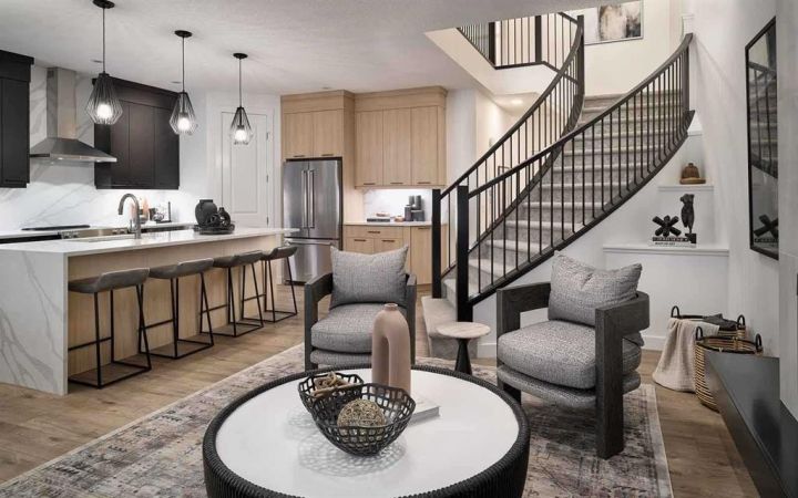 Welcome to the Robson 24 by Brookfield Residential - a stunning, move-in ready home that combines timeless design with modern functionality. Perfectly situated in the heart of Rockland Park, this home sits on a large conventional lot (not a zero lot line), offering additional space and privacy. Boasting nearly 2,300 sq. ft. of beautifully designed living space above grade, this home seamlessly blends open-concept living with thoughtful details throughout. The grand front foyer opens into a bright and airy main level featuring 9-foot ceilings, wide sightlines, and a natural flow between the living, dining, and kitchen areas. The gourmet kitchen is a chef’s dream, complete with a built-in chimney hood fan, built-in microwave, and gas range - all framed by elegant full-height cabinetry, quartz countertops, and a large central island perfect for entertaining. The kitchen overlooks the inviting living room, where a central fireplace anchors the space and creates the perfect setting for cozy evenings. A wall of windows floods the home with natural light, highlighting the spacious dining area that opens to the sunny backyard. A large main-floor office space with a full bathroom provides incredible flexibility for multi-generational living, guests, or a dedicated home office. At the heart of the home, a signature curved staircase creates a striking architectural statement - an elevated design feature rarely seen in today’s market. Natural wood and iron spindle railings lead to the upper level which opens to a central bonus room, intelligently separating the primary suite from the secondary bedrooms for optimal privacy. Vaulted ceilings in the primary bedroom create an open and spacious room that offers a luxurious 5-piece ensuite with a deep soaker tub, dual vanities, private water closet, walk-in shower with 10mm glass and an expansive walk-in closet. Two additional bedrooms, a full bathroom, and a spacious upper-floor laundry room complete the second level. The undeveloped basement features 9' foundation walls, bathroom rough-ins and a 200 amp panel, making future development that much easier. Outside, the backyard is a sun-filled retreat, providing the perfect space for outdoor entertaining and everyday relaxation. Backed by Brookfield’s comprehensive builder warranty and the Alberta New Home Warranty Program, this brand-new property offers complete peace of mind. With its architectural charm, premium finishes, and unbeatable Rockland Park location, the Robson 24 is the perfect blend of sophistication, comfort, and practicality - ready for you to call home. *Please note: Photos are of a show home model and not an exact representation of the property for sale. Interior finishes shown on photo 2.
