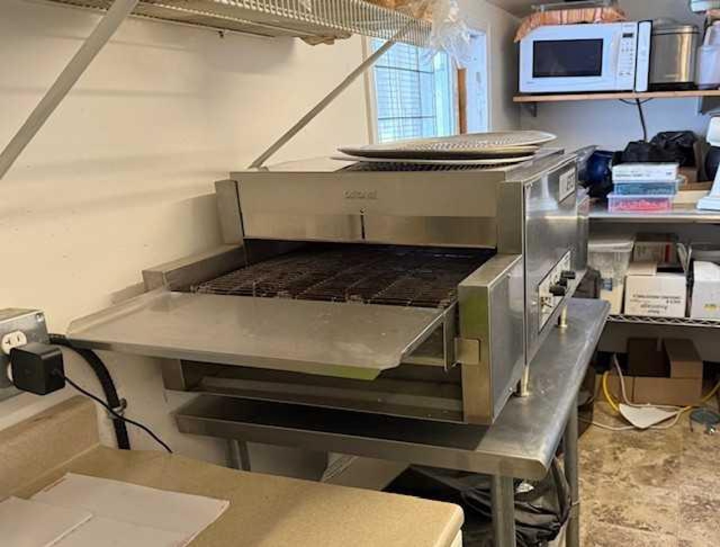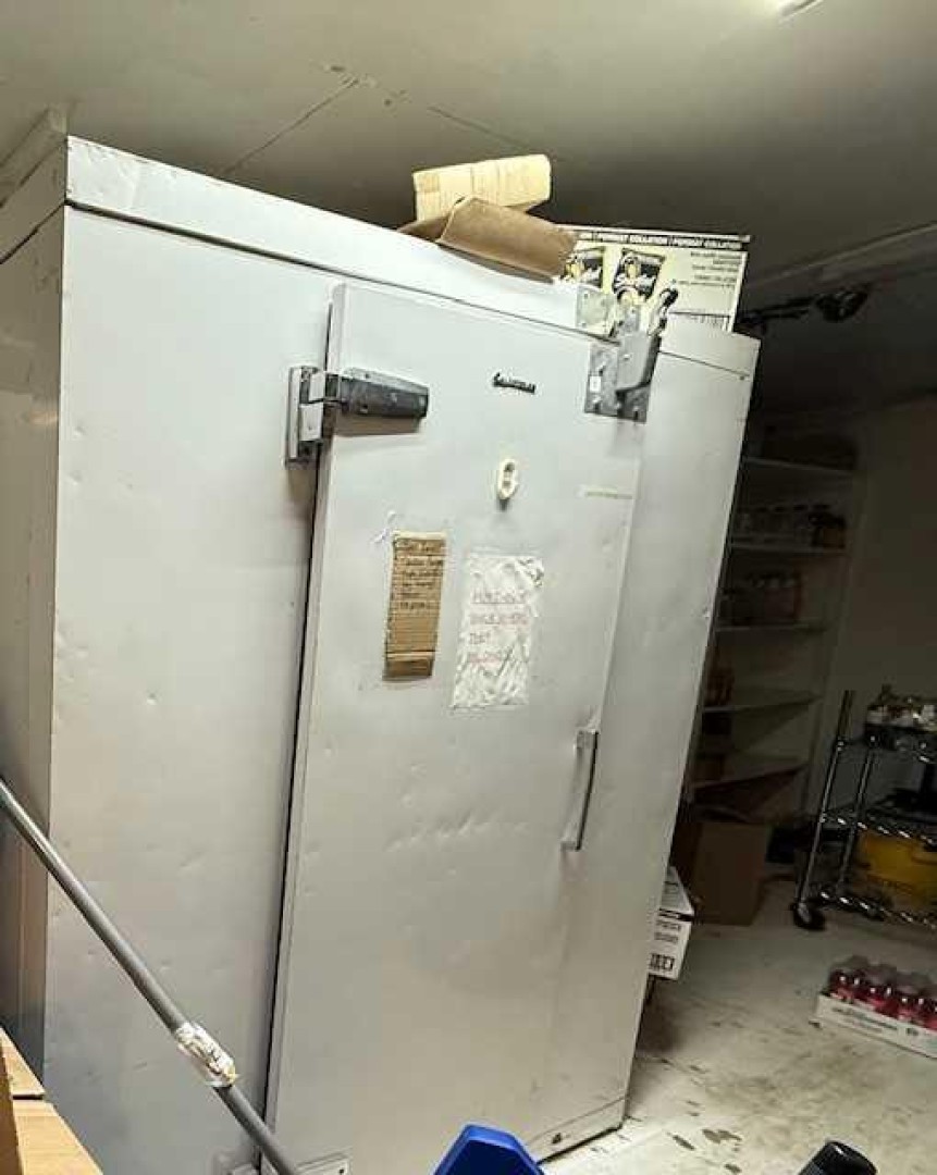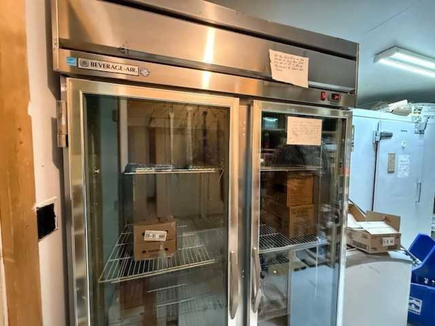 All contents, shelving & equipment in building including walk in beer cooler, 4 pop coolers, 2 glass top freezers (ice cream freezers), 3 chest freezers, 3 stand up freezers, walk in freezer, ice freezer, all kitchen equipment, fridge, stove, microwaves, pizza oven, mixer,