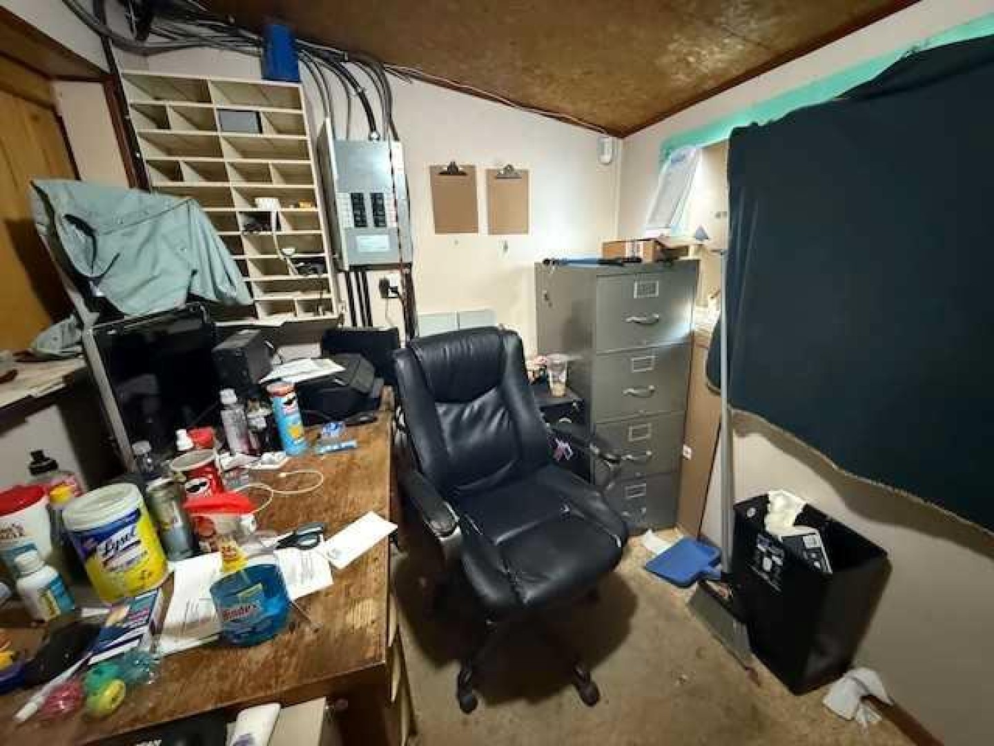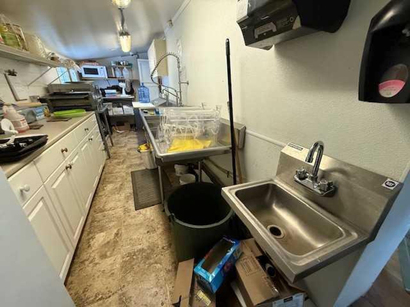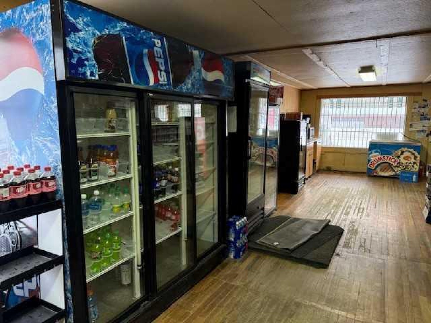 All contents, shelving & equipment in building including walk in beer cooler, 4 pop coolers, 2 glass top freezers (ice cream freezers), 3 chest freezers, 3 stand up freezers, walk in freezer, ice freezer, all kitchen equipment, fridge, stove, microwaves, pizza oven, mixer,